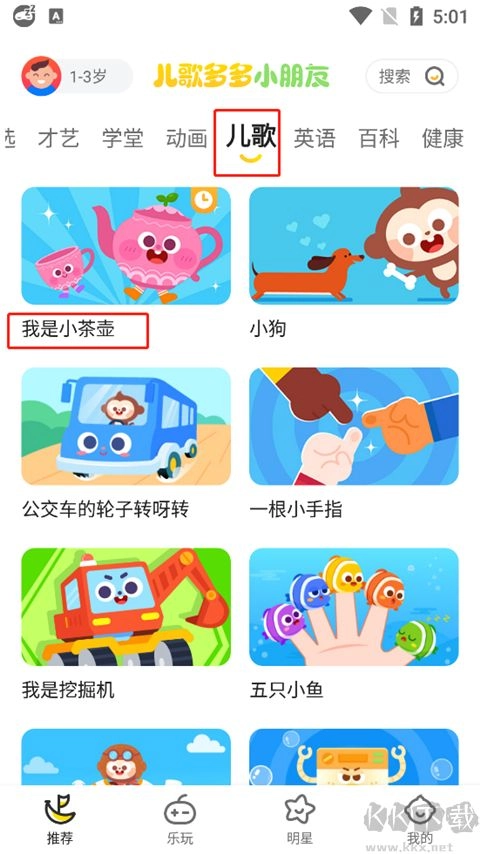 2、推荐过程中,具备才艺、学堂、动画、儿歌、英语百科等多种功能。我们选择了儿歌选项。