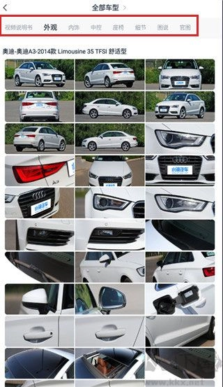 5、如图所示,能够查看已选汽车的外观、内饰、座椅等详细信息。