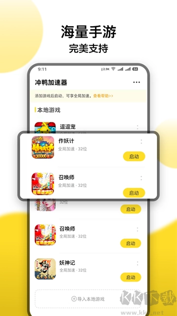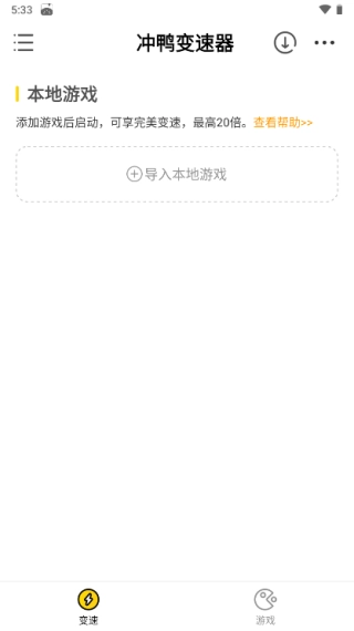 1. 启动冲鸭变速器,进入加速器的首页,接着点击“导入本地游戏”按钮。