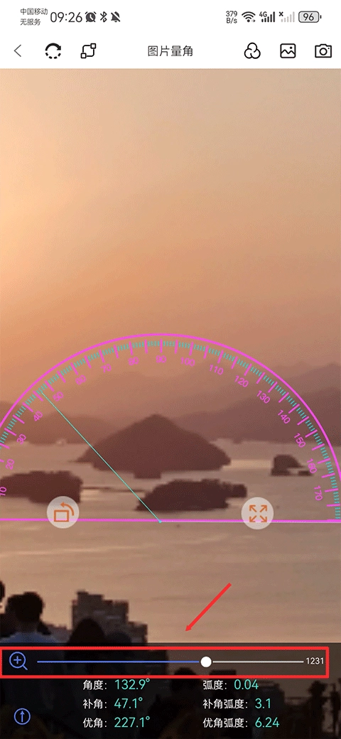 4、若测量的物体较小,你既可以用双指将图片放大,也能够拖动下方的放大条来放大量角器。