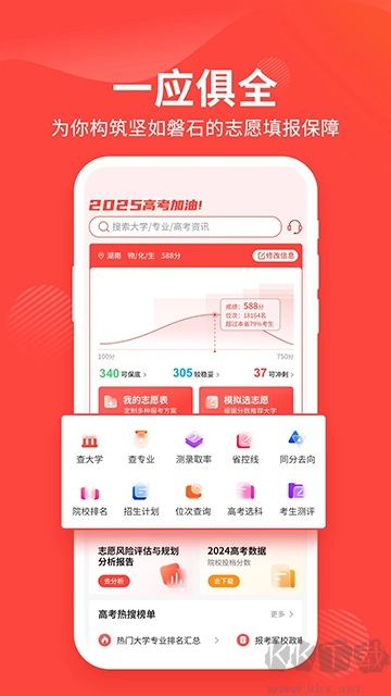 1.依据考生的成绩、位次以及兴趣特点,自动生成冲刺、稳妥、保底这三类院校的推荐方案,并模拟填报流程。