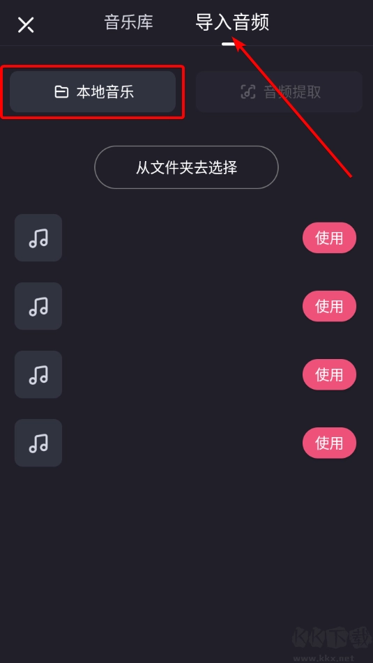 4、轻点顶部的“导入音频”选项,随即就能看见本地音乐,接着点击“使用”按钮完成导入操作。