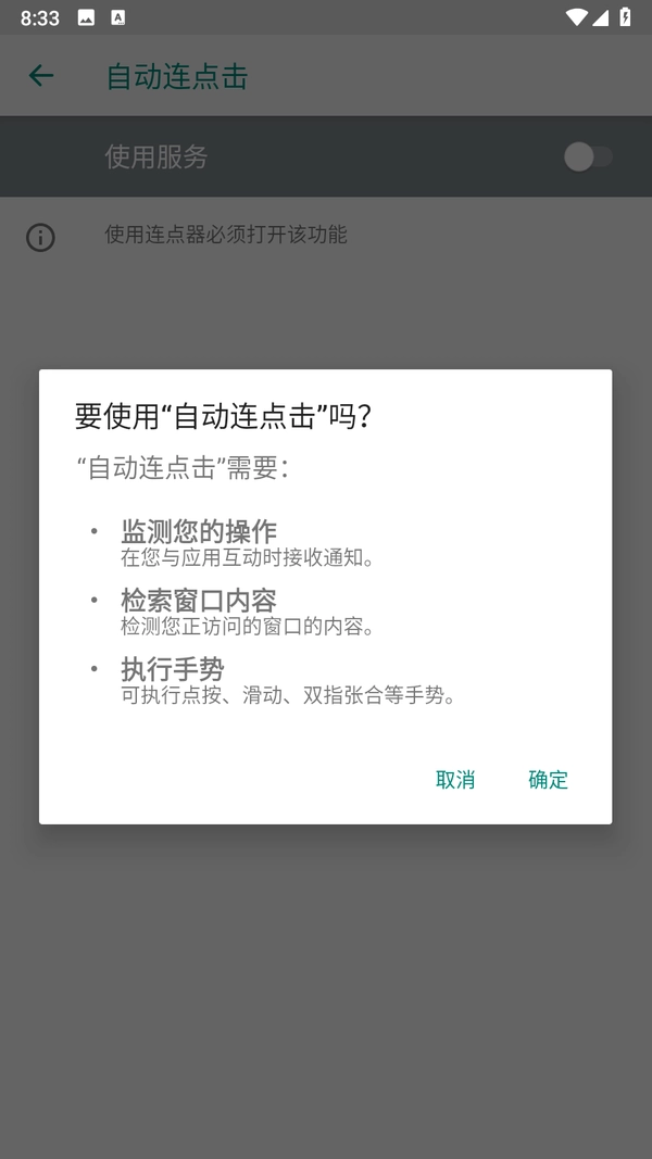 3、进入自动连点击,将使用服务开启,点击确定后就可以使用了。