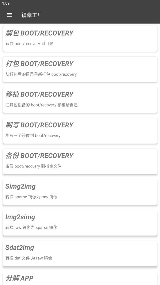 镜像工厂这是一个安卓发烧友适合的工具,此应用程序大部分功能不需要ROOT权限!