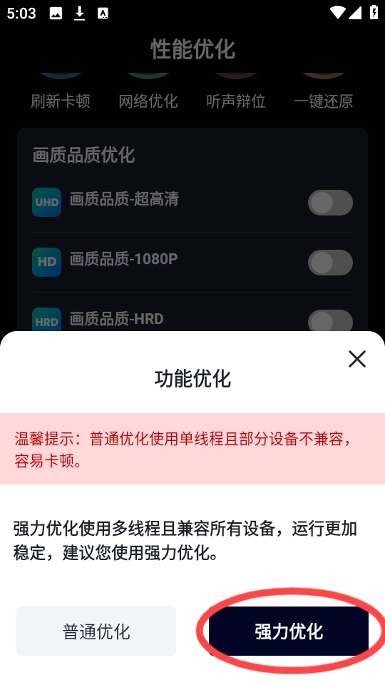 3、就拿“超高清”模式来说,点击右侧的开关按钮,接着进行“强力优化”的操作。