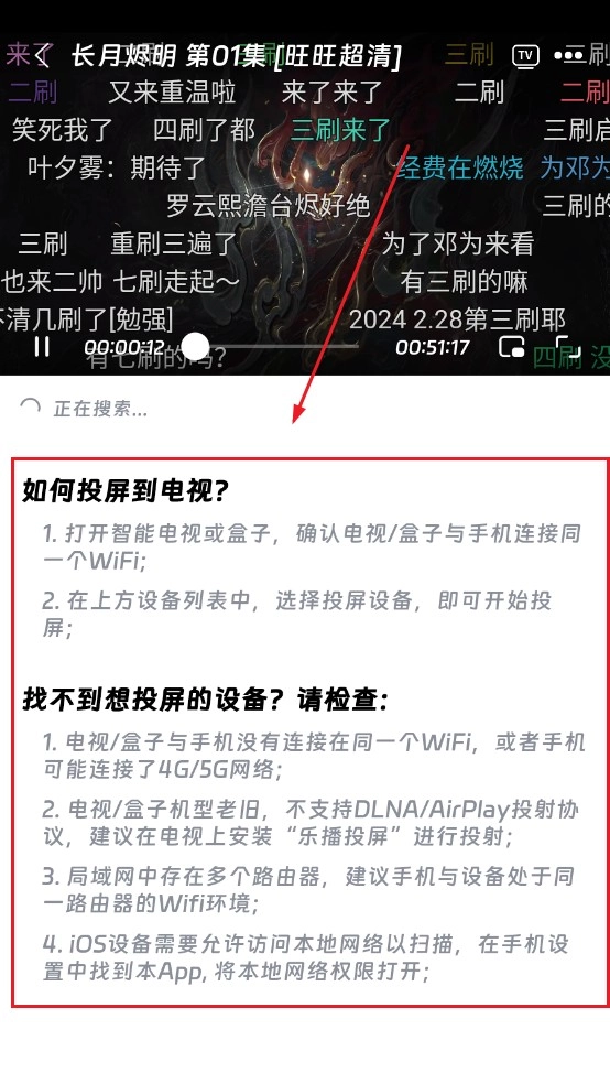 2、进入播放界面后点击右上角的tv投屏按钮,软件自动搜索附近可投屏的设备;