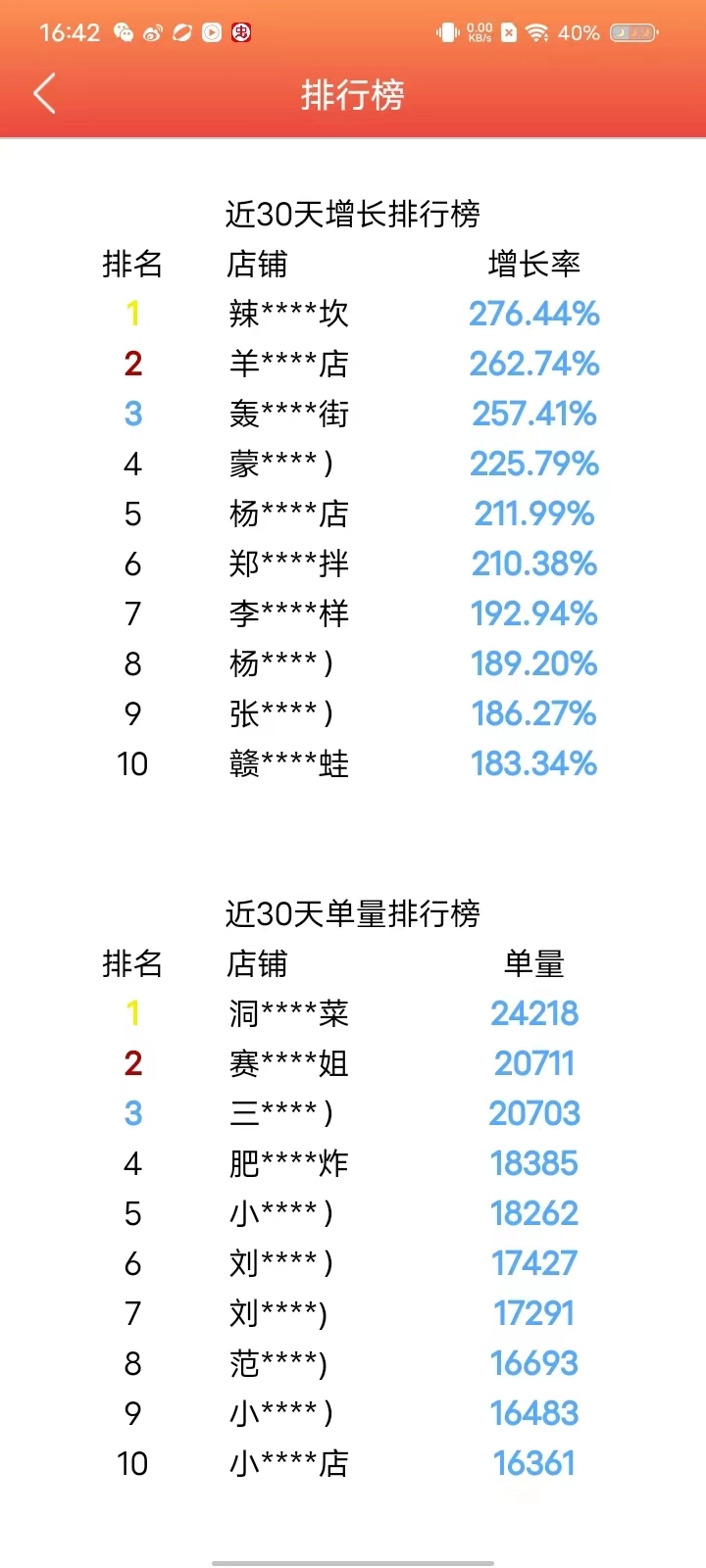 3、点击【排行榜】,能够查看近30天的增长排名和单量排名。