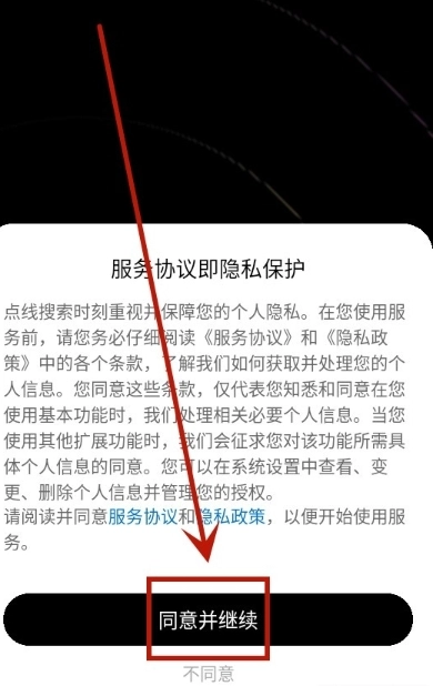 1. 先安装点线搜索,安装完成后打开该应用。进入应用界面后,点击“同意并继续”选项,同时确认同意隐私协议。