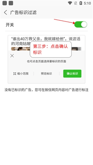5、进入广告过滤,找到下方的开关,点击右侧的按钮开启此功能