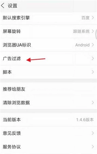 4、进入设置,找到下方的广告过滤,点击开关右侧的按钮进入