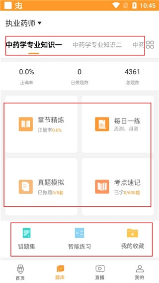 5、在题库中,可以选择自己需要学习的专业知识,下面还有一些章节精练、每日一练、真题模拟等一些比例。