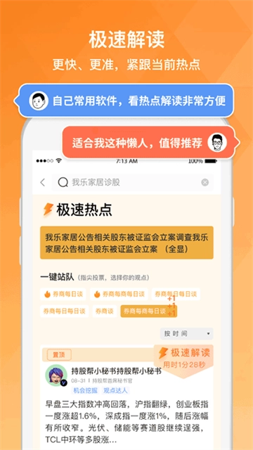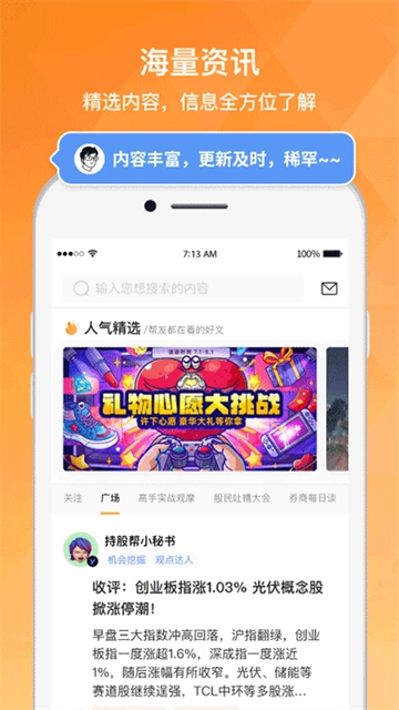 在持股帮,有着最新鲜的股市信息。你能够随时查看自己最关注股票的实时情况,以最快速度获取一手情报。而且,用户很有可能遇到投资观点和看法相近的股友,彼此之间可以一同调研挖掘牛股,携手对抗不良庄家。虽说股市冷酷无情,但股友之间情谊深厚。散户们在这里互帮互助,相互鼓励支持,盈利时有人分享喜悦,亏钱时大家抱团共渡难关。1. 个性化推荐侧重于内容关怀