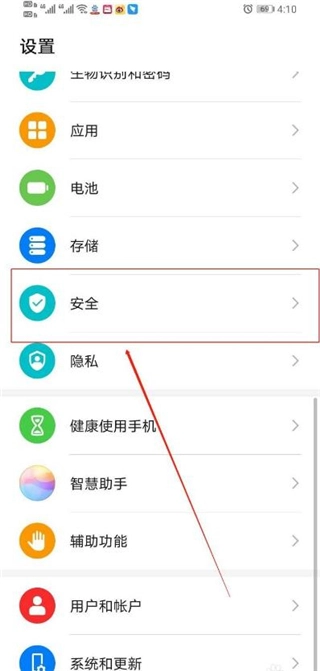 3、进入“设置”页面后,向上滑动手机屏幕,找到“安全”选项,具体位置可参考图示 。