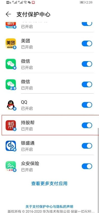 5、点击进入“支付保护中心”,在这个界面里找到“持股帮”,把它后面的开关条关闭就行。具体可参照图示。
