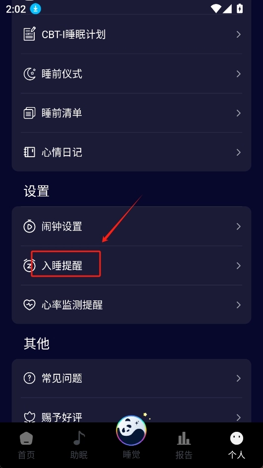 2. 向下滑动屏幕,找到“入眠提示”,然后点击进入。