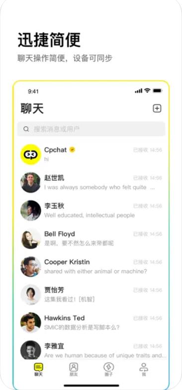 cpchat这是一款可以在线进行聊天互动的手机app,我们可以使用这款app随时在线进行互动交友,这里汇聚全国何地的优质单身用户,大家可以使用这款app轻松进行快速脱单,这里拥有专业的话题交流社区,大家可以在这里自由选择不同的话题,并且所有的用户都是实名验证的,真实在线交友。