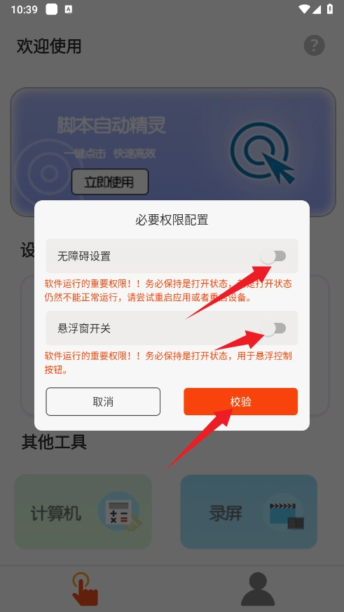 2、接着开启【无障碍设置】与【悬浮窗开关】这两个必要的控制按钮。之后点击【校验】,若校验通过,则意味着开启成功。