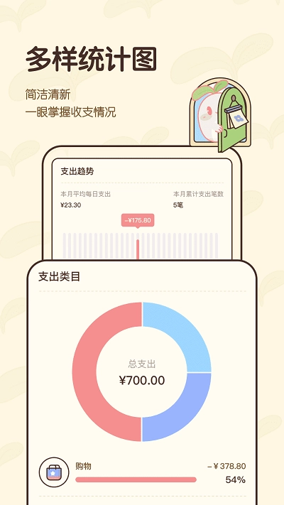2、统计图表多样化,可以直观的查看到每一笔消费情况。