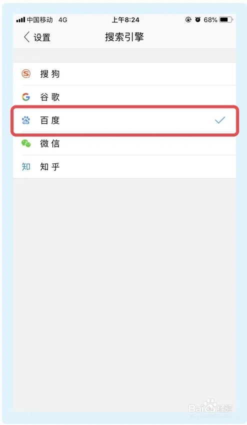 5、在【搜索引擎】界面,点击【百度】选项,完成以上步骤搜狗浏览器即可设置搜索引擎。