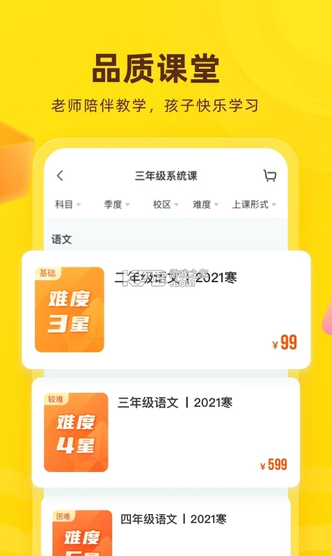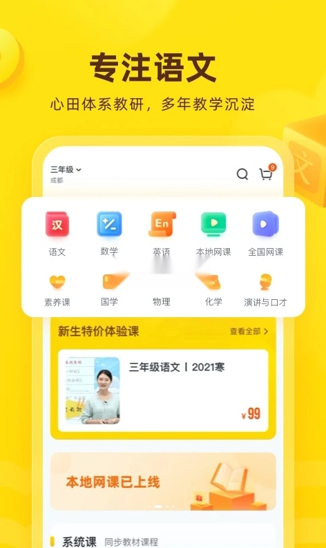课程以语文为核心,覆盖数学、英语等全学科,以及人文、历史、艺术等素质类课程。
