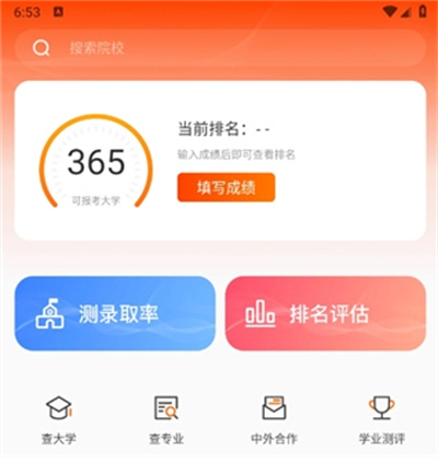 1. 打开软件,首页设有查大学、查专业、中外合作、学业测评、测录取率、排名评估等服务。