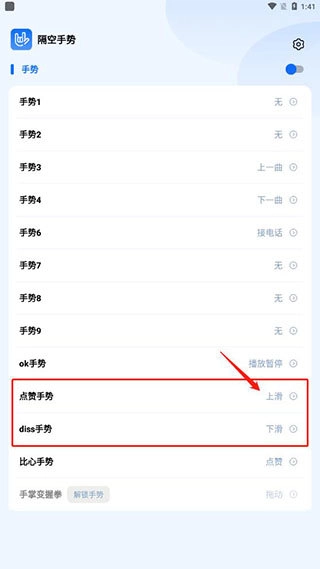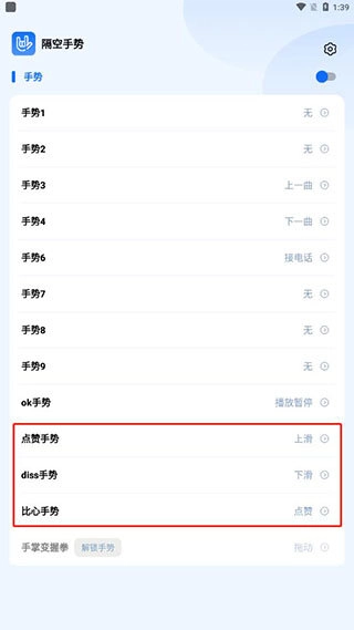 1、打开后,能看到里面有诸多手势设定,在下方可以看到点赞、diss、比心等手势设置。