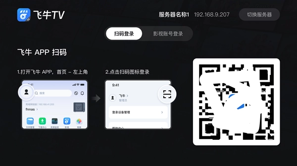 3. 当成功连接到飞牛影视服务器后,就需要登录影视账号。你能够通过以下2种方式来登录影视账号: