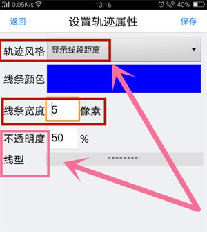 5、在轨迹属性设置界面,能够对轨迹的样式风格、颜色、线条宽度等参数进行设定,完成后点击保存,具体操作位置如图所示。