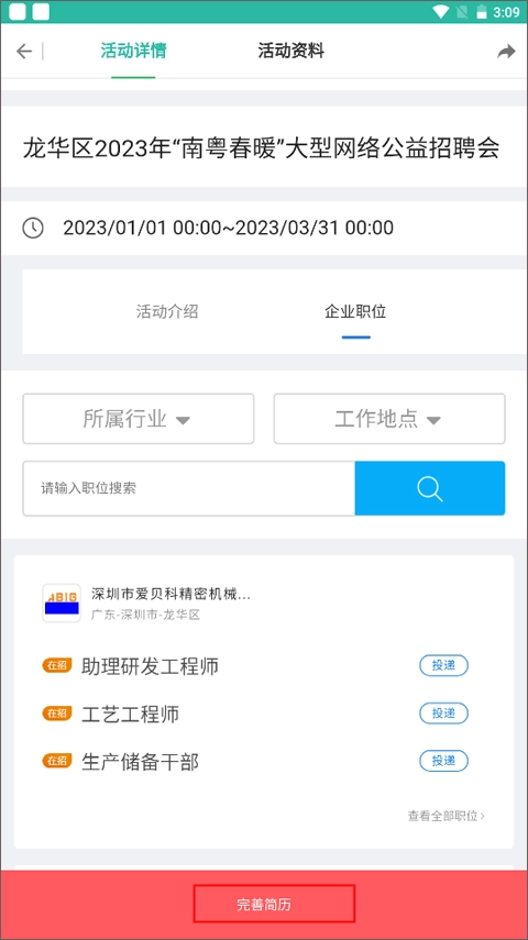 3、在此处,你能够查看活动详情及相关资料。在本公司,你既可以搜索心仪的工作岗位,也能依据下方发布的职位进行挑选,而后点击“个人报名”。