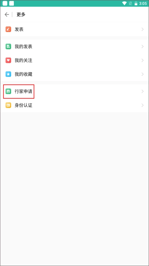 2. 在“更多”页面,你能看到发表、我的发表、我的关注、我的收藏、行家申请、身份认证等选项,此时点击“行家申请”。