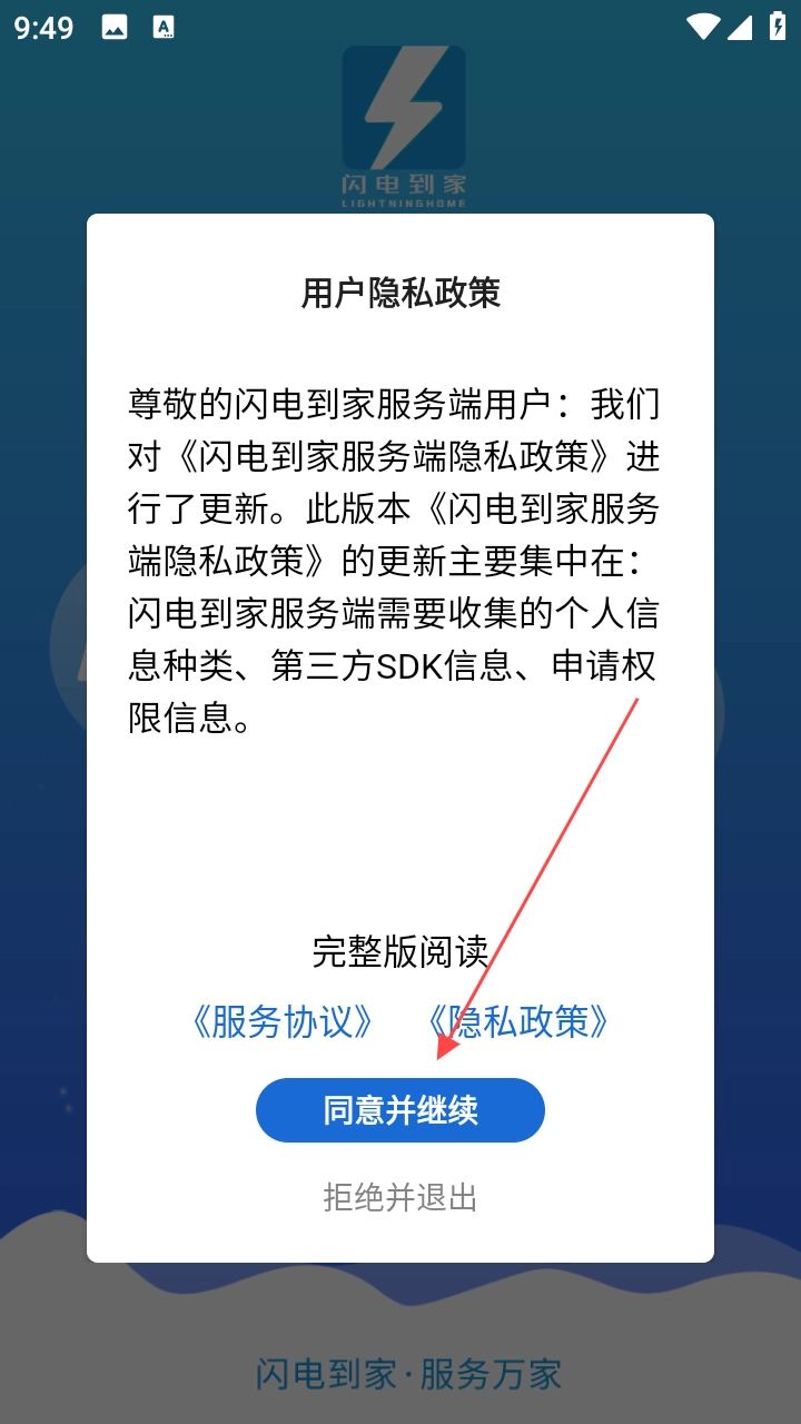 1. 开启闪电到家服务端,此时会弹出用户隐私政策弹窗,点击【同意并继续】,随即进入登录/注册页面。