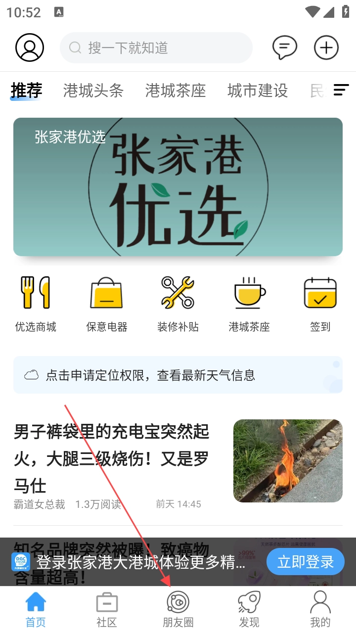2. 打开应用,进入首页,点击底部的【朋友圈】选项,随即进入动态浏览页面。
