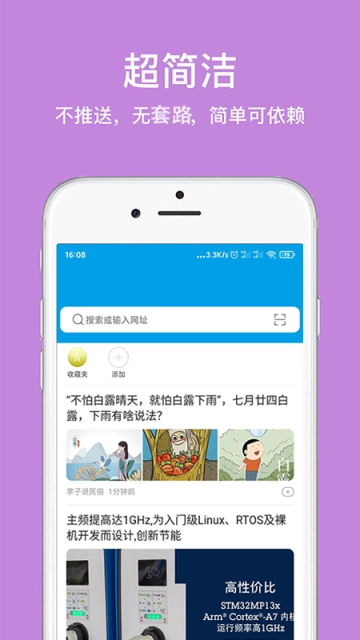 内存占用超低,轻巧且极速。支持各大主流搜索引擎。仅呈现每日精选新闻,设计风格极简,、推送与过多新闻。极大节省您的上网流量与手机内存资源,为您打造绿色浏览器,还您简洁上网环境。