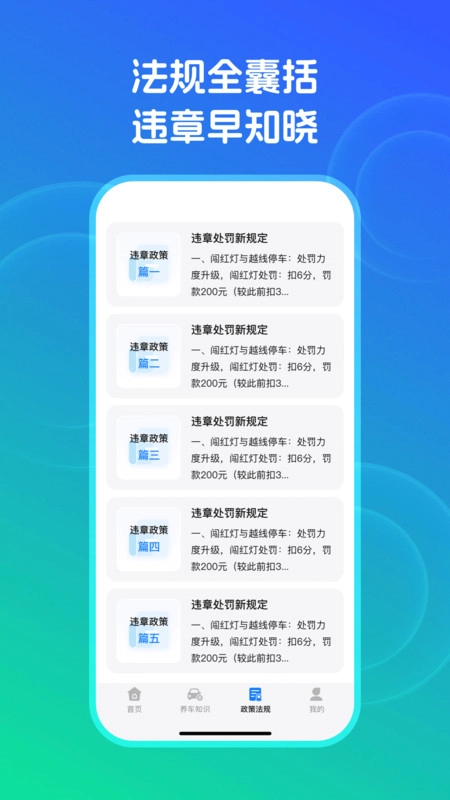 3、政策法规页面包含众多违章政策,可在此及时了解各类新规定等知识。