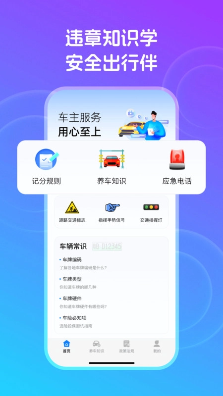 1. 首页呈现了记分规则、养车知识、应急电话、道路交通标志、指挥手势信息以及交通指挥灯等内容。