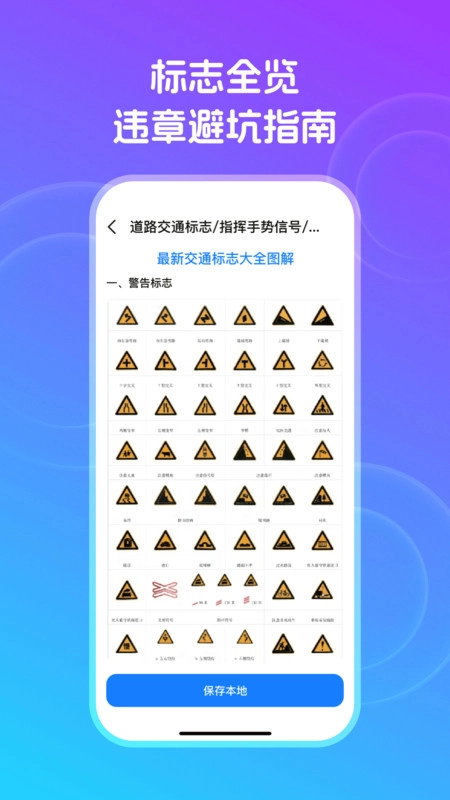 1. 交通标志全览,汇总常见及生僻交通标志的详细解释,方便用户随时查询,确保行车合规性。