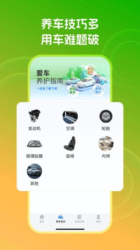 2、养车知识页面涵盖发动机、空调、轮胎、玻璃贴膜、座椅、内饰及其他版块。