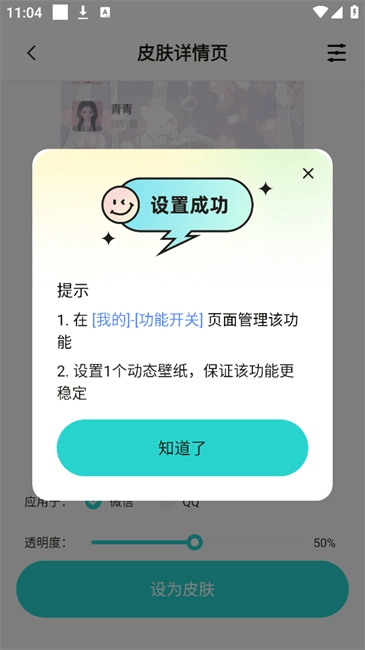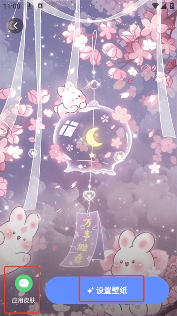 2. 点击“应用皮肤”,能够一键将当前主题设定为微信或QQ背景;而点击“设置壁纸”,则能直接把所选壁纸应用为手机背景。