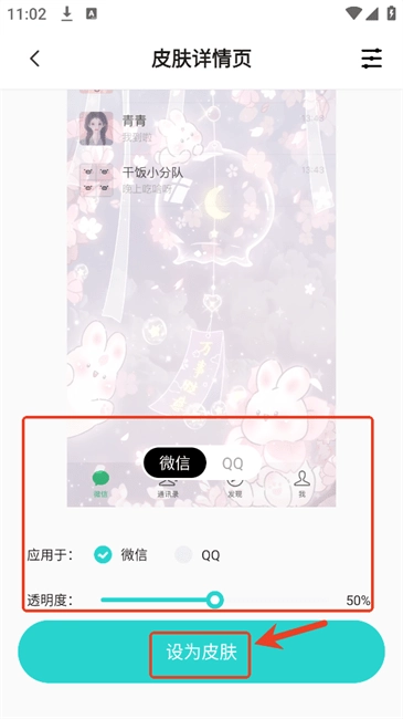 3. 在此,以“应用皮肤”这项操作为例。首先点击“应用皮肤”,接着从微信和 qq 中选择其一,设置好透明度之后,再点击“设为皮肤”。