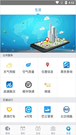 5、于生活页,用户能够运用公共服务与交通出行功能,借此随时查看公交路线。