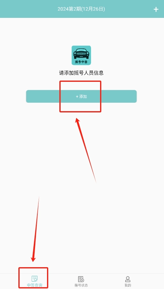 3、完成登录后,返回首页并点击添加按钮,填入需要查询的摇号人信息,随后即可一同查看结果。