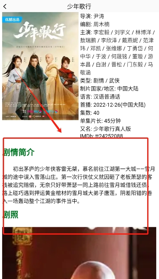 2、于详情页处向下滑动屏幕,即可看到完整的演员阵容介绍以及详细的剧情内容简介。