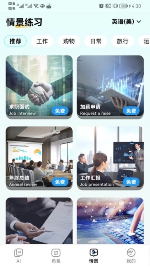 2、情景口语练习模块允许用户在各种场合模拟对话,极大增强了口语沟通的灵活性与适应能力。