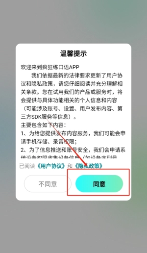 1、点击同意按钮,顺利进入应用界面,开启全新的口语学习体验。