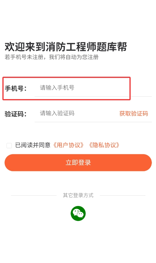 1. 开启消防工程师题库帮后,首次使用时需输入本人手机号码以完成自动注册。