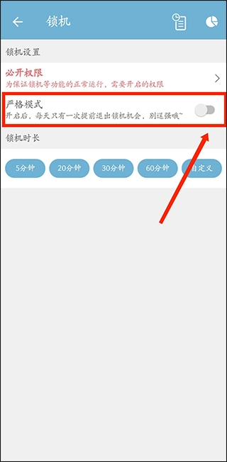 4、于【锁机】页面内寻得【严格模式】,点击开启,便能启动锁机。