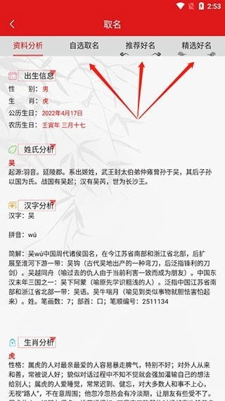 1. 在首页输入本人或伴侣的姓名,点击“资料分析”,即可查看该名字的相关资料。