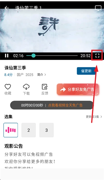启动云朵视频应用,找到目标影视内容的页面,轻触播放区域后,点击全屏显示的按钮。