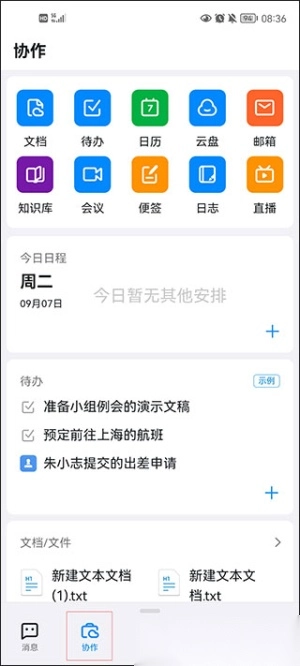 软件的协作板块中,文档、待办、日历、云盘、邮箱、知识库、便签等各类工具已准备就绪,供用户随时使用。