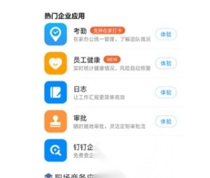 打开工作台后,软件提供了一系列办公必需的功能,涵盖考勤管理相关的打卡、签到、请假与补卡申请,流程处理类的OA审批,沟通协作方面的视频会议、电话会议和办公电话,人事管理范畴的智能人事与员工健康,还有日志记录、云端办公空间、钉邮服务以及群直播等智能办公工具。